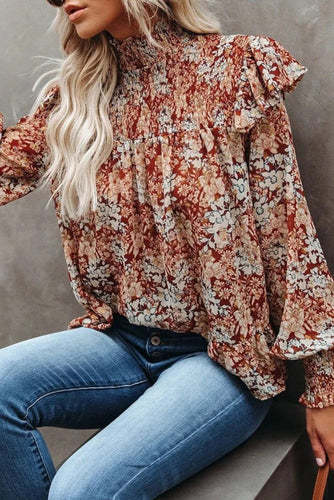 Gold Flame Floral Smocked Sleeve High Neck Ruffled