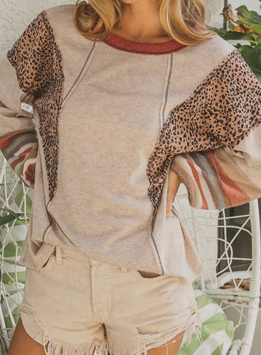 Khaki Leopard Serape Patchwork Exposed Stitching Pullover Top