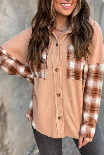 Waffle Knit Plaid Patchwork Hooded Shacket