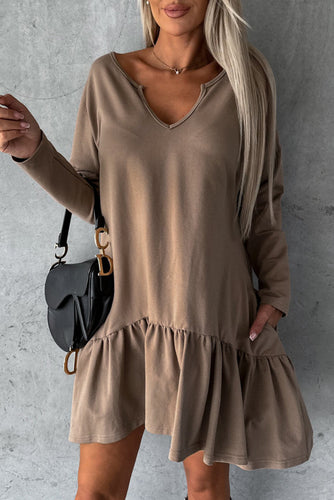 Split Neck Long Sleeve Ruffled Loose Dress