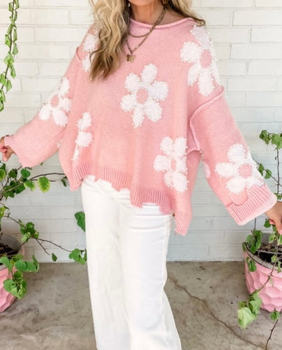 Pearl Beaded Floral Drop Shoulder Sweater