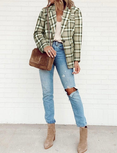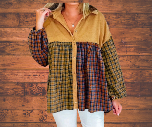 Mustard Contrast Plaid Print Puff Sleeve Shirt