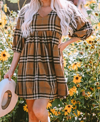 Brown Plaid Pattern Empire Waist Babydoll Dress