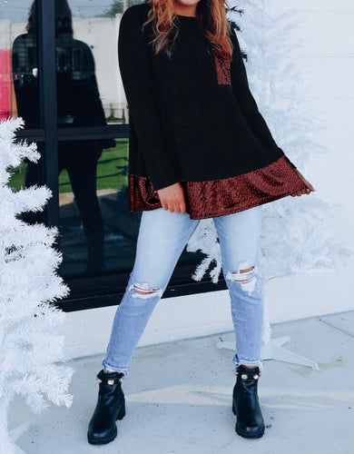 Fiery Red Sequin Patch Pocket Ruffle Hem