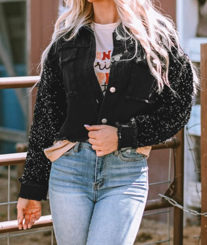 Sequin Sleeve Pocketed Raw Hem Denim Jacket
