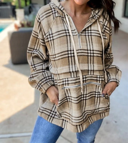 Khaki Printed Zipped Front Pullover Plaid Hoodie