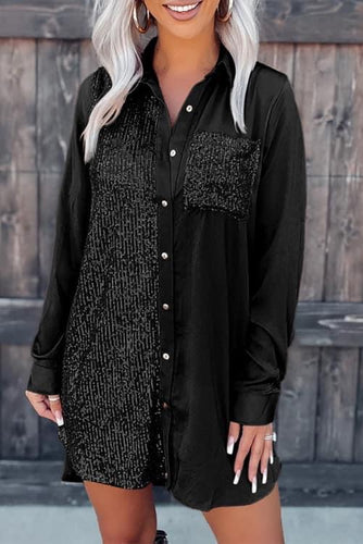 Sequin Splicing Pocket Buttoned Shirt Dress