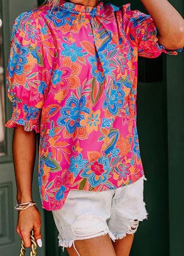 Rose Frilly Mock Neck Short Puff Sleeve Floral Blouse