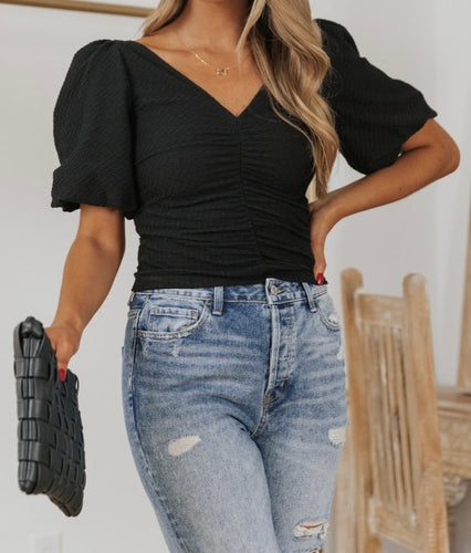 V Neck Ruched Front Puffy Sleeve Blouse