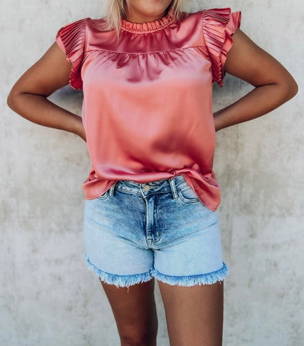 Satin Fringed Ruffle Sleeve Mock Neck Blouse