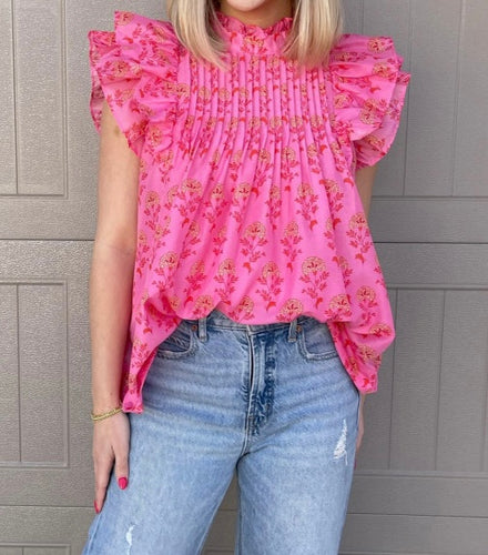 Floral Print Pleated Ruffled Flutter Sleeve Blouse