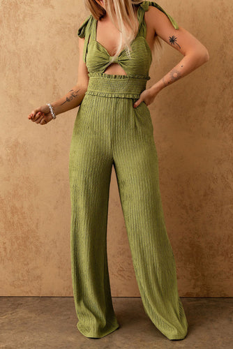 Shirred Knotted Front Tied Shoulder Wide Leg Jumpsuit