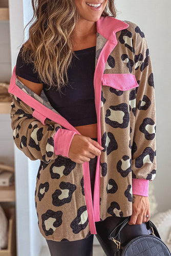 Leopard Ribbed Contrasting Trim Collared Jacket