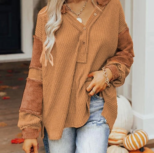 Contrast Patched Exposed Seam Waffle Knit Henley Top