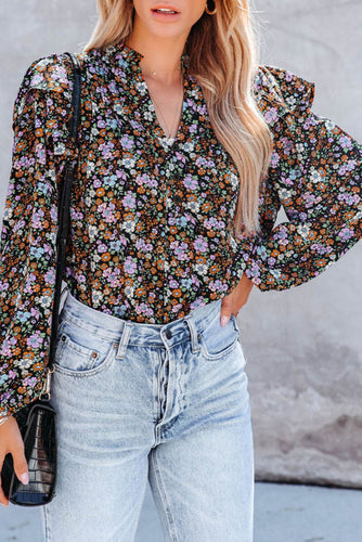 Leopard Split Neck Hollowed Lace Trim Babydoll Blouse