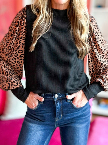 Leopard Print Long Sleeve Ribbed Knit Blouse