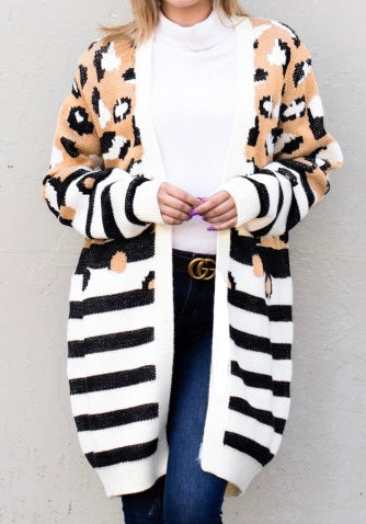 Leopard Striped Mixed Print Open Front Cardigan