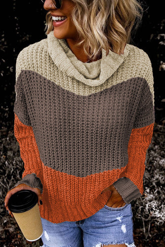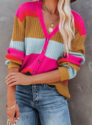 Rose Color Block Knitted Buttoned V Neck Sweater