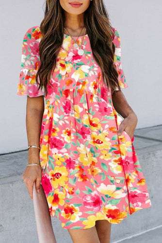 Floral Ruffled Sleeve Pocketed Flared Mini Dress