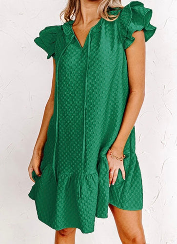 Green Flutter Sleeve Ruffled Textured Shift Dress