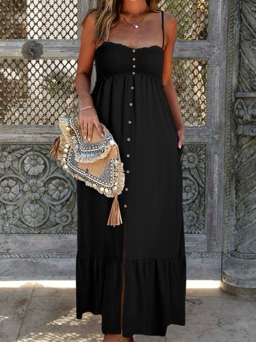Spaghetti Straps Smocked Front Slit Buttoned Dress
