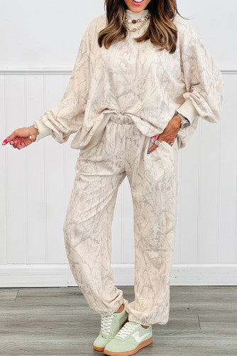 Brown Braided V Neck Long Sleeve Loose Top and Drawstring High Waist Pants 2pcs Outfit