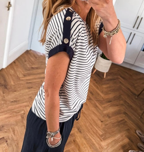 This black striped loose tee is the perfect mix of comfort and casual style. Designed with cuffed sleeves and subtle button details, it adds a little extra interest to a classic everyday top.