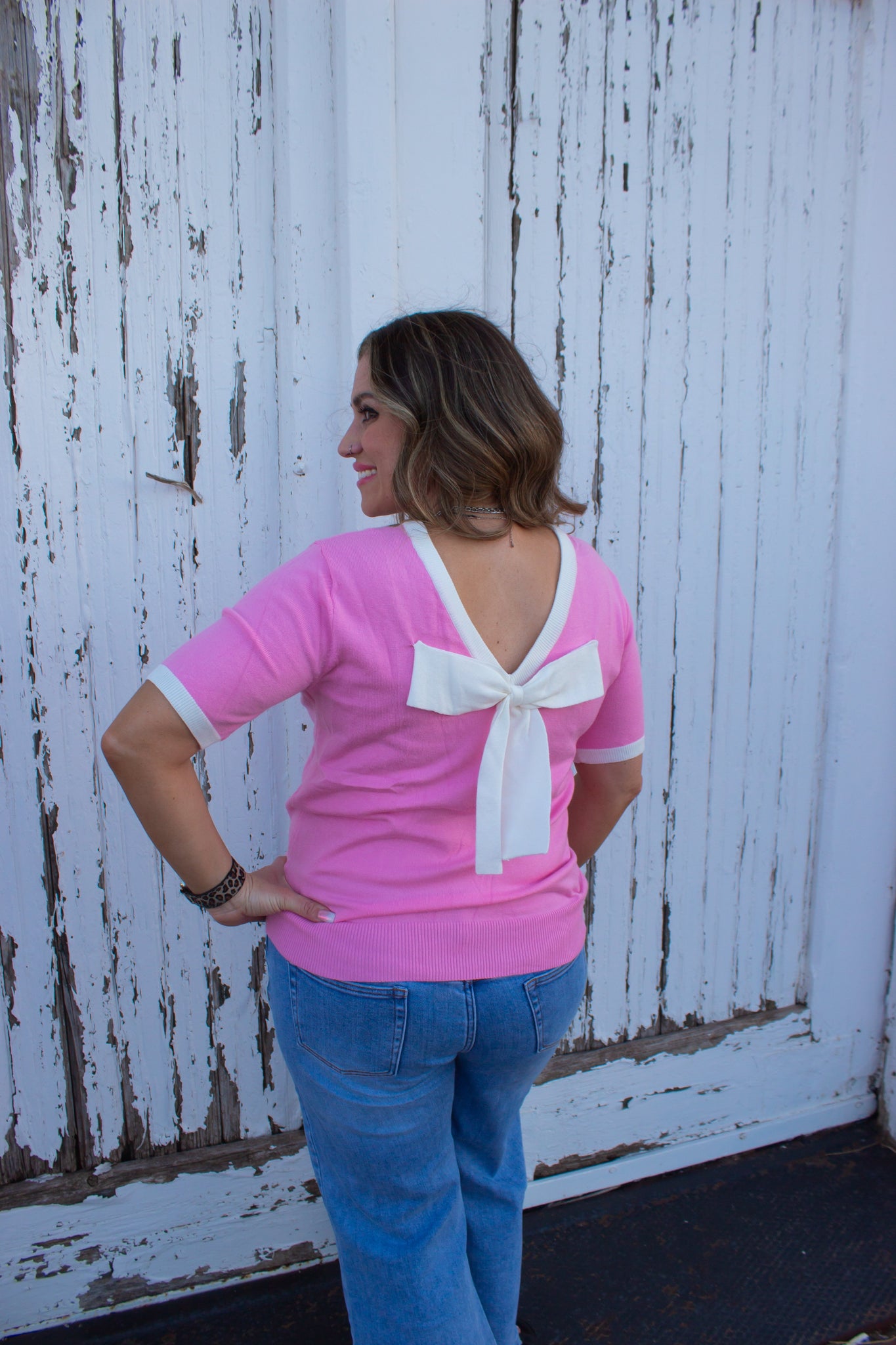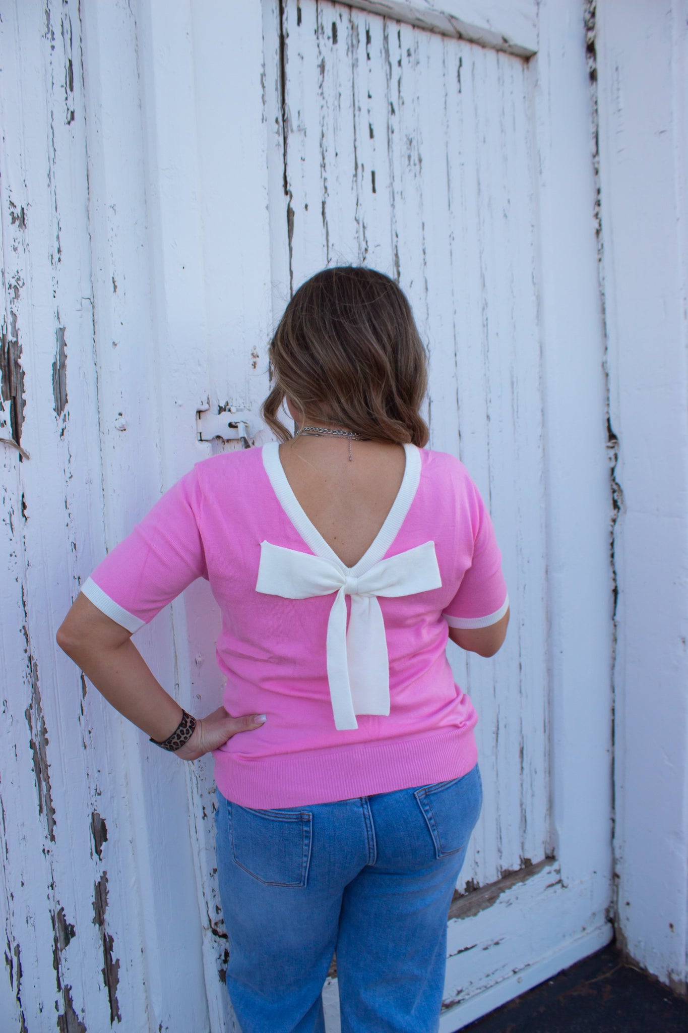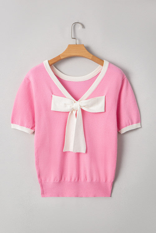Upgrade your wardrobe with our Bow V-Shape Cut Back Short Sleeve Sweater—a chic blend of comfort and style. Featuring a trendy V-shaped back cutout with a delicate bow detail, this lightweight sweater adds a flirty touch to any outfit. The soft knit fabric and short sleeves make it perfect for layering or wearing solo. Pair it with high-waisted jeans or a skirt for an effortlessly stylish look. Shop now for the perfect mix of cozy and fashionable!