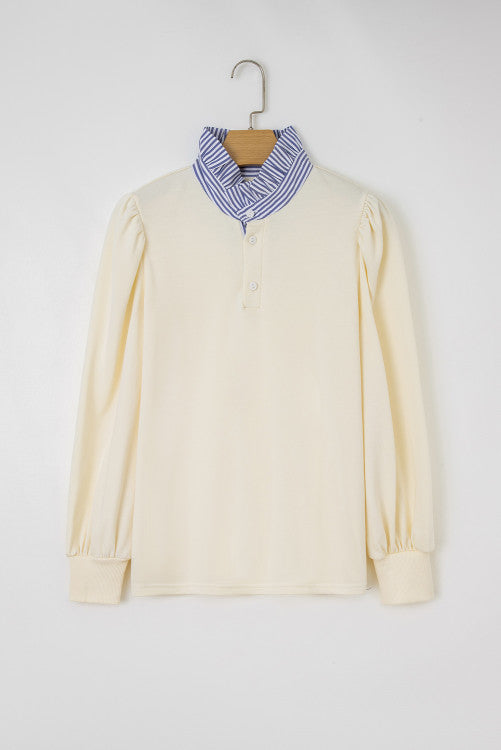 Cozy meets chic with this button-up striped collar sweatshirt. The playful patchwork and puff sleeves give it that “I just threw this on but still look put together” energy. It’s soft, comfy, and has just enough detail to stand out on a coffee run, a casual Friday, or school pick-up. Pair it with denim for an effortless vibe or leggings when you’re all about comfort.