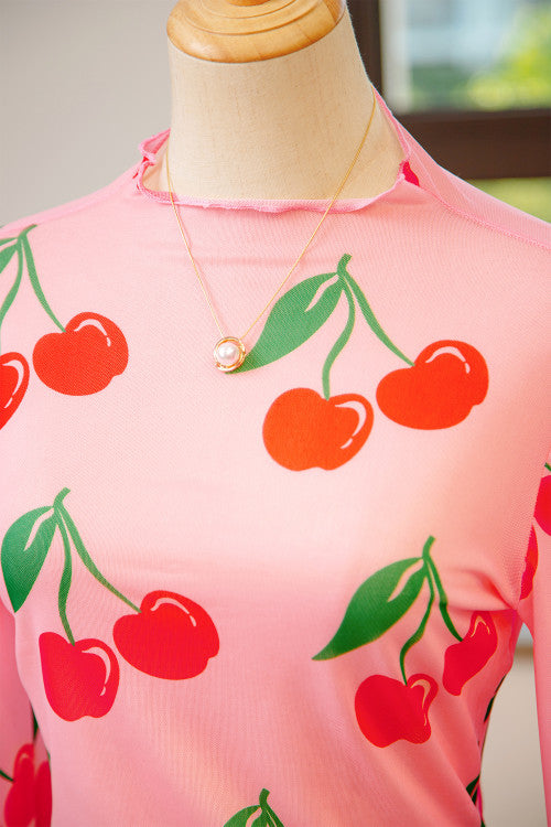 This long sleeve mesh top features an all over cherry print with delicate lettuce trim details for a playful, feminine touch. The lightweight mesh fabric makes it perfect for layering or wearing solo when you want something fun and eye catching.