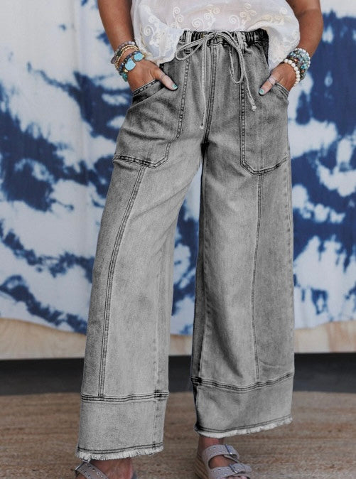 Say hello to your new denim obsession. With their relaxed wide-leg cut and raw hem finish, these jeans bring just the right mix of casual edge and all-day comfort. The adjustable drawstring waist keeps the fit effortless, while the seam details add a subtle modern twist.