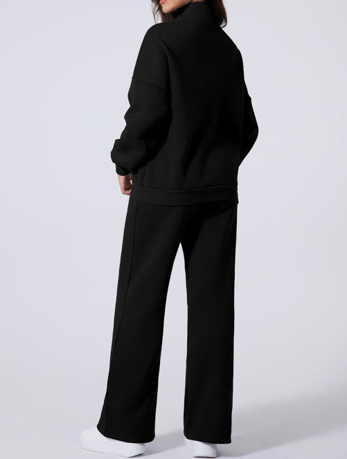 This two-piece active look features a slouchy drop shoulder zip-up jacket and adjustable drawstring pants made for movement, lounging, or those in-between days where you just need to feel like you’ve got it together.