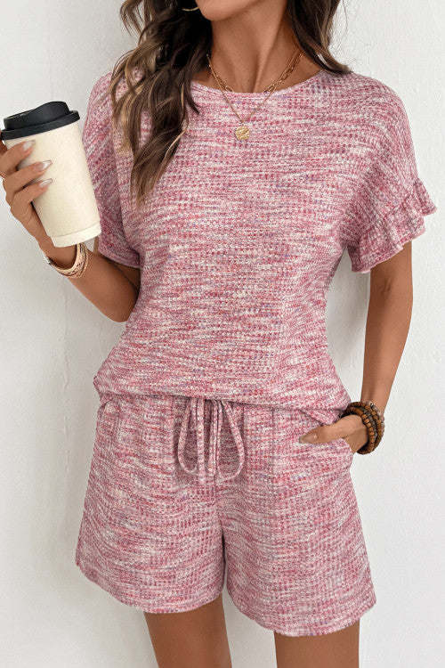Made for comfort, styled to stand out. This Heather Textured Set features a ruffle sleeve top with soft structure and charm, paired with relaxed drawstring shorts for the ultimate lounge-to-street outfit. The textured fabric adds dimension, while the coordinating pieces make it easy to look polished with zero effort.