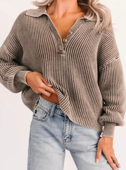 This mineral-washed knit sweater features a relaxed fit, cozy feel, and subtle polo collar with button detail for a lived-in yet elevated vibe.