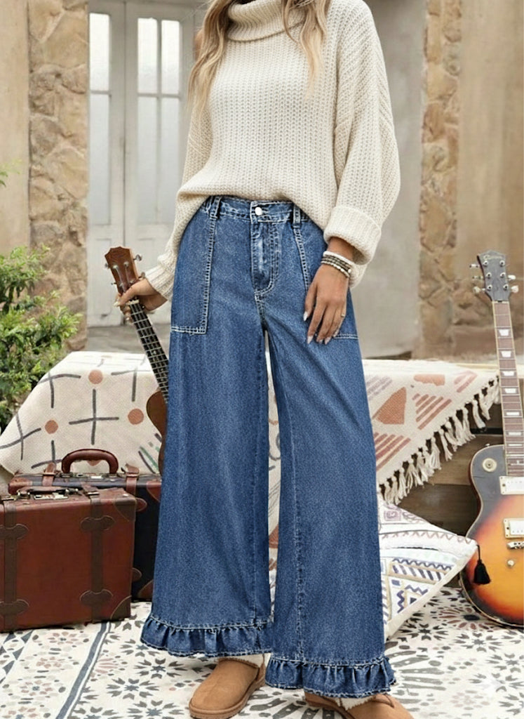 Designed for curvy comfort with a whole lot of flair. These wide-leg denim pants feature an elastic waistband for a flexible fit, statement ruffle details, and flowy legs that move with you. Perfect for dressing up or staying chill — they bring style without the squeeze.