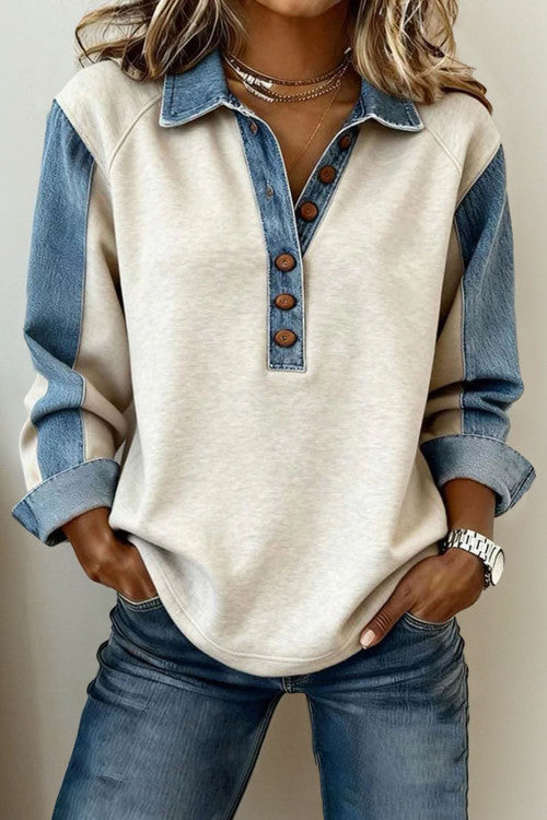 Preorder Denim Patchwork Buttoned Polo Collar Long Sleeve Top