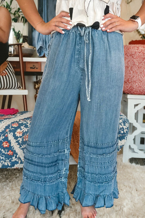 Elevate your everyday with these wide leg chambray pants featuring a flattering high-rise fit and playful ruffled hem. Soft, breathable, and effortlessly stylish, these pants offer the perfect balance of structure and ease. Dress them up with a tucked-in blouse or go casual with a tee and sneakers — either way, they bring an airy, feminine feel to your closet staples.