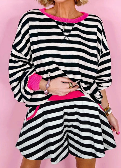 Cozy meets chic in this striped contrast set, featuring a loose long sleeve blouse and relaxed-fit shorts with ribbed banding details. Designed for comfort and style, this set is your go-to for casual errands, weekend lounging, or quick coffee dates. Pair it together for an easy outfit win or mix and match for endless styling options.