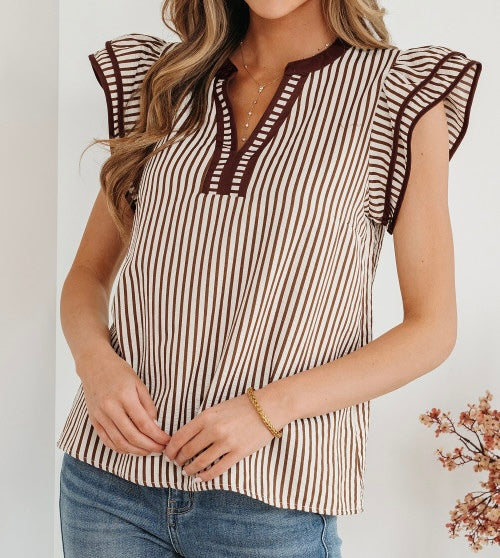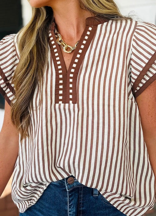 Brown Stripe Double Ruffled Short Sleeve V Neck Blouse featuring soft neutral stripe detail, feminine double ruffle sleeves, and a flattering v neckline. This lightweight striped blouse pairs perfectly with denim, trousers, or skirts for an effortless everyday look. A versatile women’s boutique top designed for casual styling, work outfits, or weekend wear.